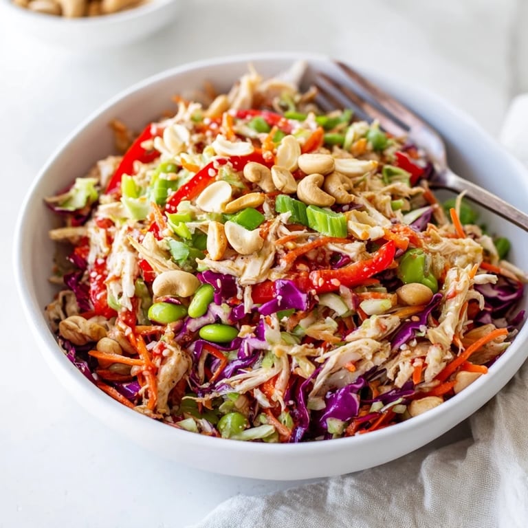 I discovered this during one of those frantic weeknight moments when I had leftover rotisserie chicken and a random bag of edamame from the freezer. Now its the only salad my teenage son actually requests by name. We've started calling it our emergency dinner because everything can come from the pantry or freezer.