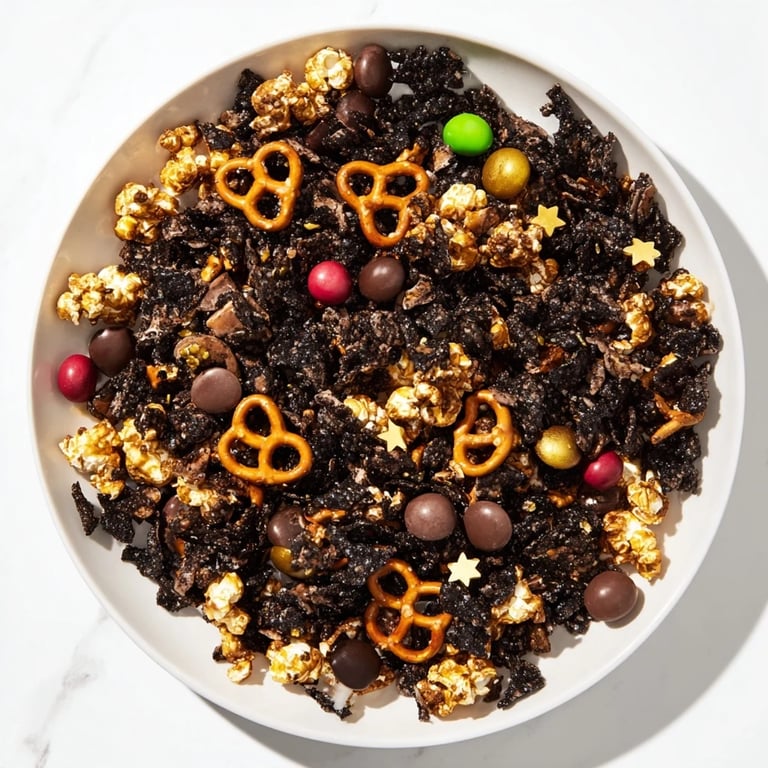 Pin It A festive, sweet-and-savory snack mix featuring gold and black ingredients—perfect for ringing in the New Year with style and crunch.