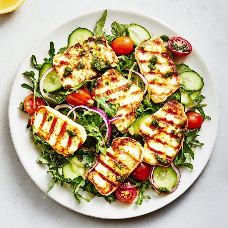Pin It A vibrant, summery dish featuring golden grilled halloumi cheese served atop a bed of crisp vegetables and drizzled with fresh basil pesto. Perfect for a light, garden-inspired dinner.