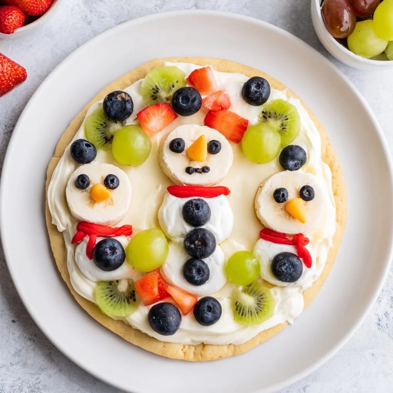 Pin It A playful and colorful dessert pizza featuring sugar cookie crust, creamy frosting, and fresh fruit, decorated to resemble melting snowmen—perfect for kids and winter celebrations.