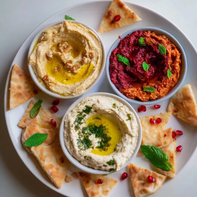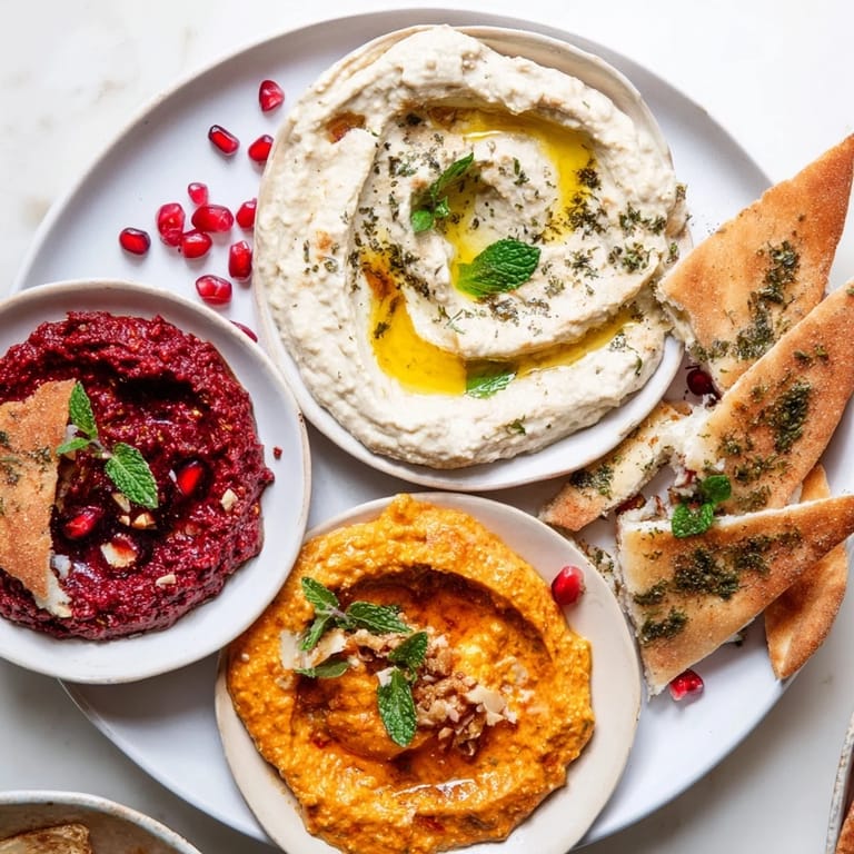 Serve this before a substantial main course—it's an opener, not a meal. The variety keeps guests engaged and prevents any single flavor from dominating their palate before dinner begins. If you're serving it as the main event, pair it with something simple like roasted vegetables or grilled fish. I've learned that people want to taste everything, so offer small portions of each element. The bread matters here; warm, good bread gives people something substantial to anchor their dips to, and it buys you time while you finish other dishes. A crisp white wine, sparkling water with fresh mint, or Moroccan mint tea alongside makes the experience feel complete.