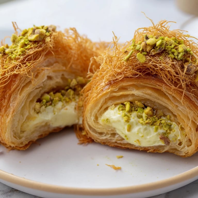 These are honestly best eaten fresh, when the phyllo is still crackling and the croissant layers are at their peak flakiness. But I've discovered something interesting: if you store them in an airtight container overnight, the croissant layers soften slightly and the pistachio cream becomes even more velvety. It's not the same as fresh, but it's genuinely good—more like eating a soft, luxurious pastry than a crispy one. They'll keep for up to 2 days, though by day 3 the phyllo has surrendered to humidity and you're left with something that's still delicious but no longer textured the way it deserves to be.