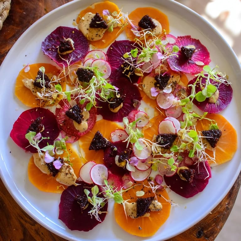 Pin It I discovered this dish almost by accident one autumn evening when I was playing with leftover beets and couldn't decide which color to use. Instead of choosing, I laid them side by side and watched how they caught the light differently—one glowing warm gold, the other deep ruby red. That's when it clicked: what if the plate itself told a story about contrast and shadow? The result was something I kept coming back to, not just because it tasted bright and alive, but because every time I made it, the arrangement felt like solving a small visual puzzle.
