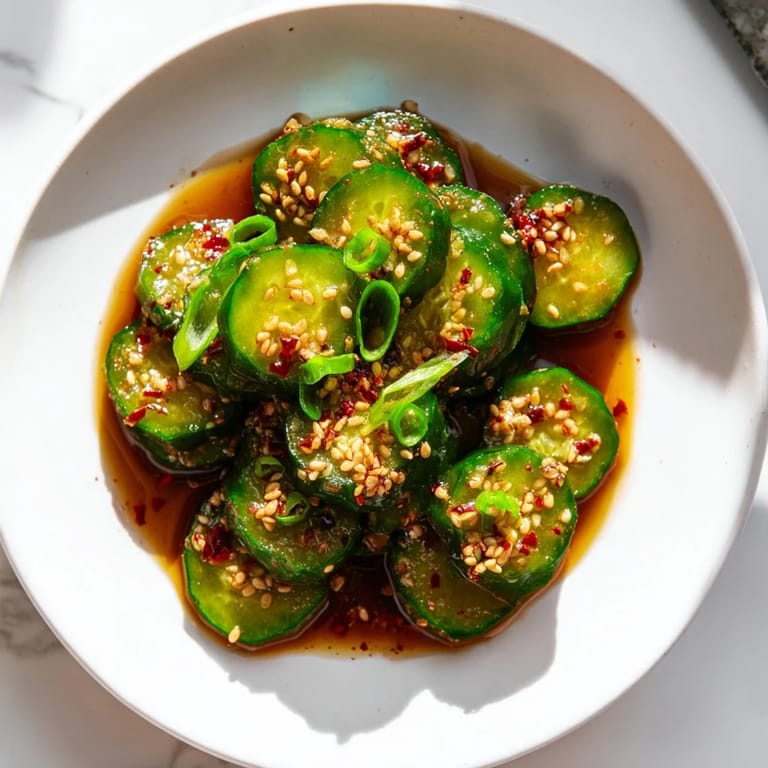 These cucumbers shine brightest when served as part of a spread of small dishes, especially alongside spicy foods where their cool crunch provides welcome relief. At my house, they often appear alongside grilled salmon or tucked into rice bowls topped with a fried egg. The leftover liquid makes an incredible marinade for chicken or tofu, extending the usefulness of this humble dish beyond its first serving.