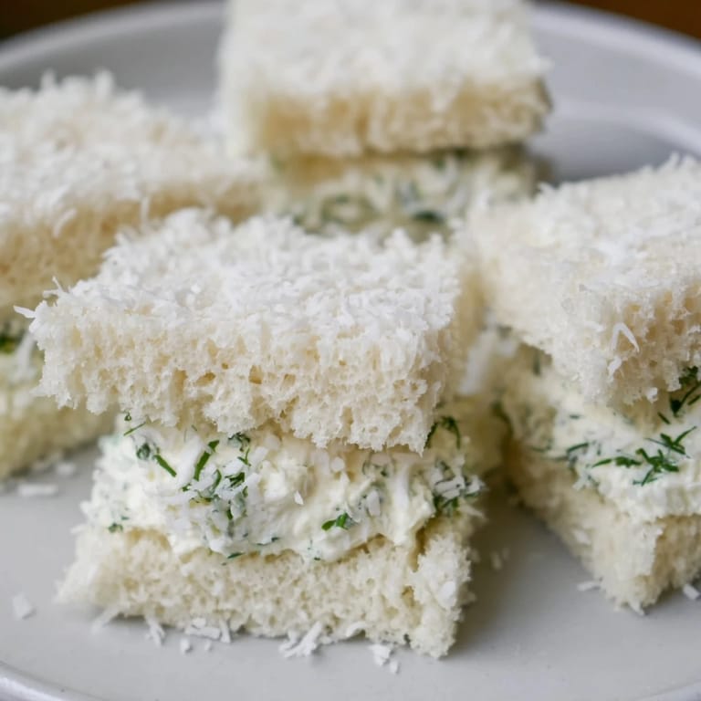 Pin It Delicate, fluffy tea sandwiches with a creamy filling, elegantly rolled in shredded coconut to resemble tiny snowballs perfect for winter gatherings or afternoon tea.