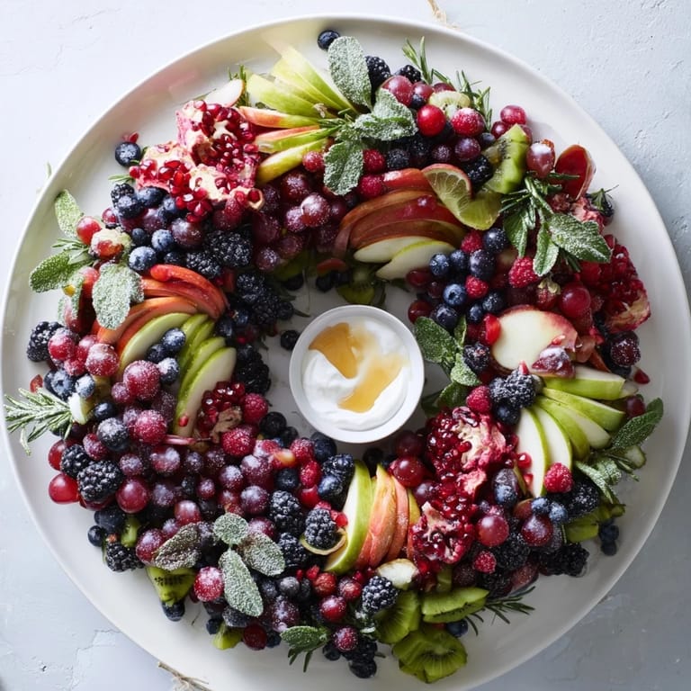 Pin It A festive and visually stunning fruit platter arranged in a wreath shape, featuring seasonal winter berries and fresh fruits—perfect as a healthy holiday centerpiece.